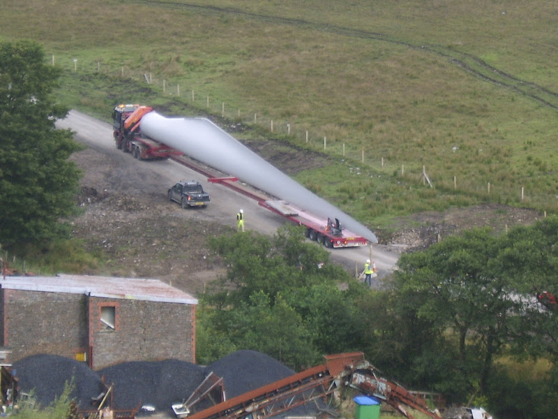 No it's not a flying Saucer, it's a Turbine Blade Photographed from a distance over from Mynydd y Betws, better fotos on the way from our Gwerin Owain - Glyndwr Rambler who has been camping and active all week around the Windmill Plantation - We went up to resupply with food and Camera Batteries late last night - a police patrol passed us twice - keeping an eye on us. They sure are worried and seem convinced we will attempt direct action as 'Civil Disobedience' or sabotage but of course we may do the former but creatively but not employ methods of Militant Sabotage, fin!